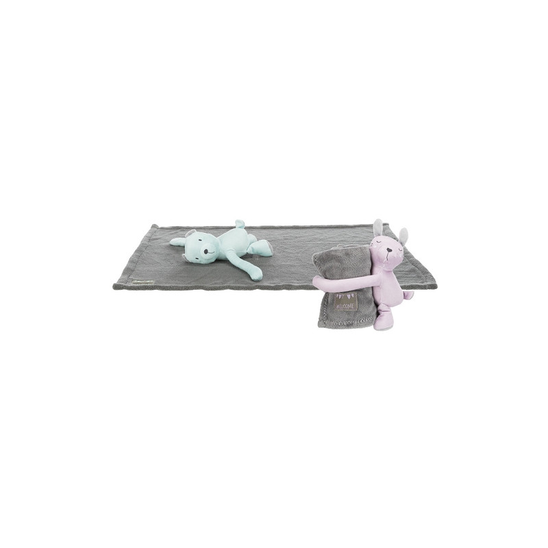mit Decke und Plüschtier (Polyester) Spielzeug mit Sound: maschinenwaschbar bis 30°C die Decke ist für Allergiker geeignet Modell 1: Maße: 75 × 50 cm / Farbe: grau/lila Modell 2: Maße: 75 × 50 cm cm / Farbe: grau/mint
