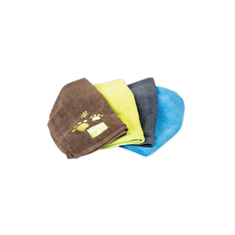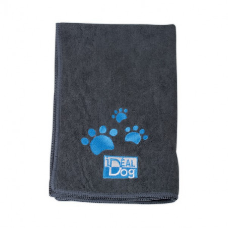 Set of 2 super absorbent IdealDog microfiber gray towels 40 cm x 60 cm (small model) or 60 cm x 100 cm (large model). 80% polyester 20% polyamide. Washable at 30°C.